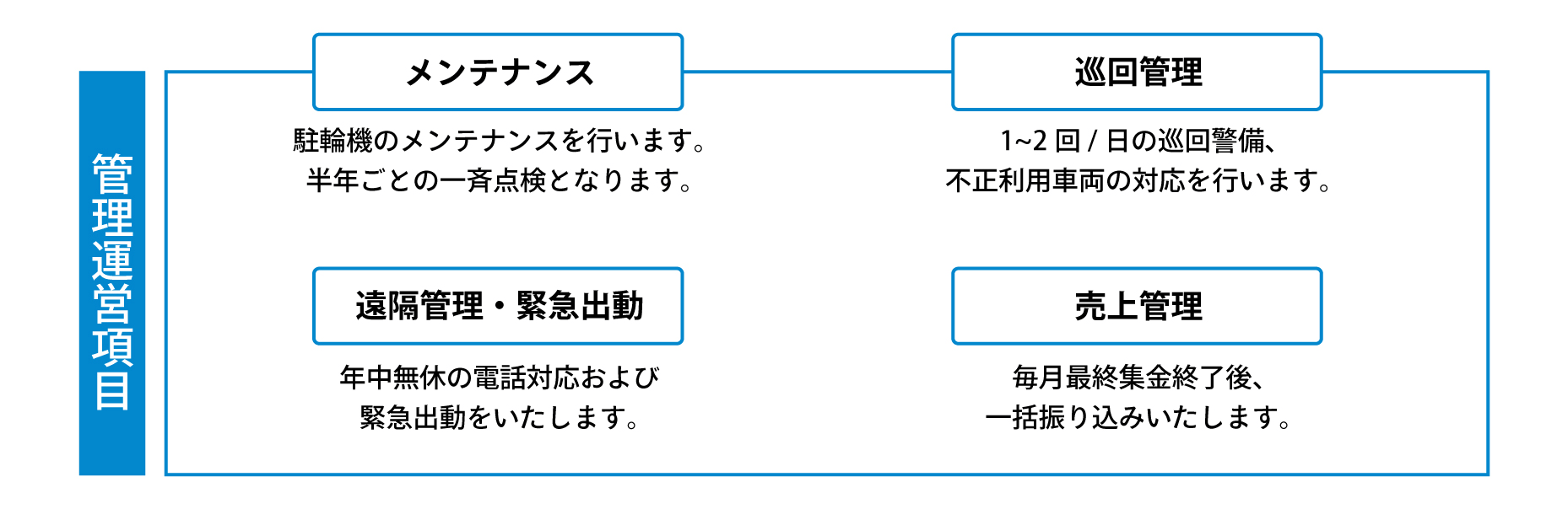オーナー様に機器を買い取っていただくプランで、収入は駐輪場の利用料になります。運営管理はビシクレットに委託することも可能、自由に取捨選択が出来ます。